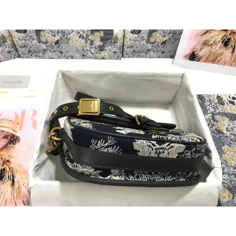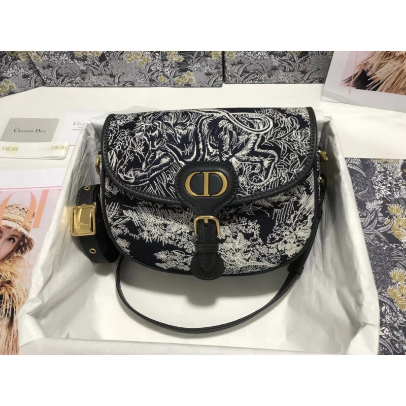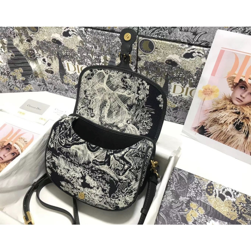 Embroidered Toile de Jouy motif and finished with antique gold-tone hardware. The detachable, adjustable shoulder strap with military buckle fits in the hand, over the shoulder or across the body.