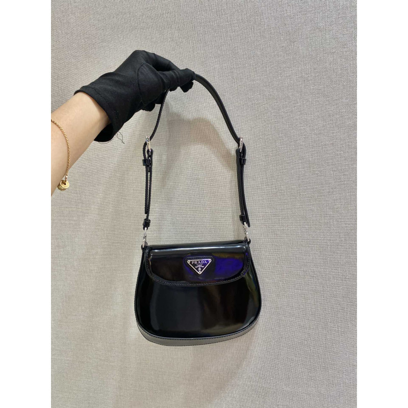 DetailThe special beveled structure of the bottom and sides of this flap bag emphasizes the smooth curved lines and gives it a sophisticated appeal, while the extended handles make it even more functional, allowing it to be worn as a shoulder bag or a tote. Brushed leather, unique to the Prada collection, is a modern, color-changing material perfect for new combinations and contrasts. A triangular enameled logo completes the silhouette.