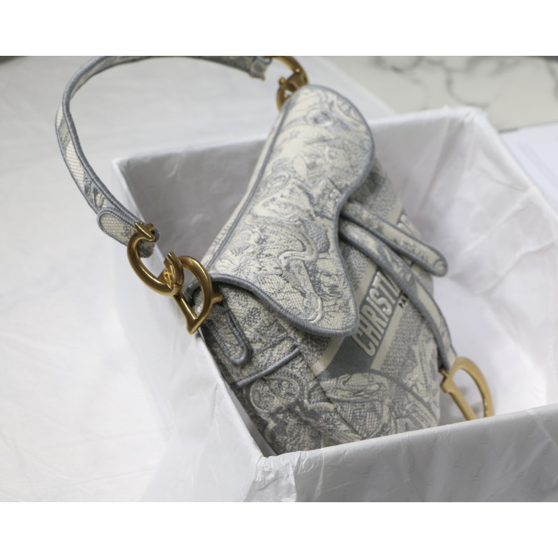 DetailEmbroidered with the Toile de Jouy motif, it reveals a saddle flap with a magnetic D-shaped stirrup clasp, as well as a CD signature in antique gold-finish metal on either side of the shoulder strap. This saddle bag has an adjustable and detachable spaghetti strap and can be carried by hand, over the shoulder or across the body.