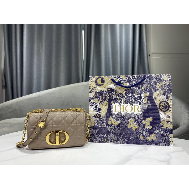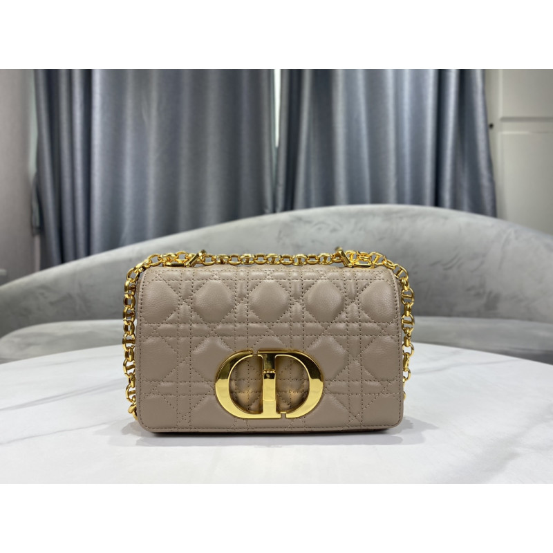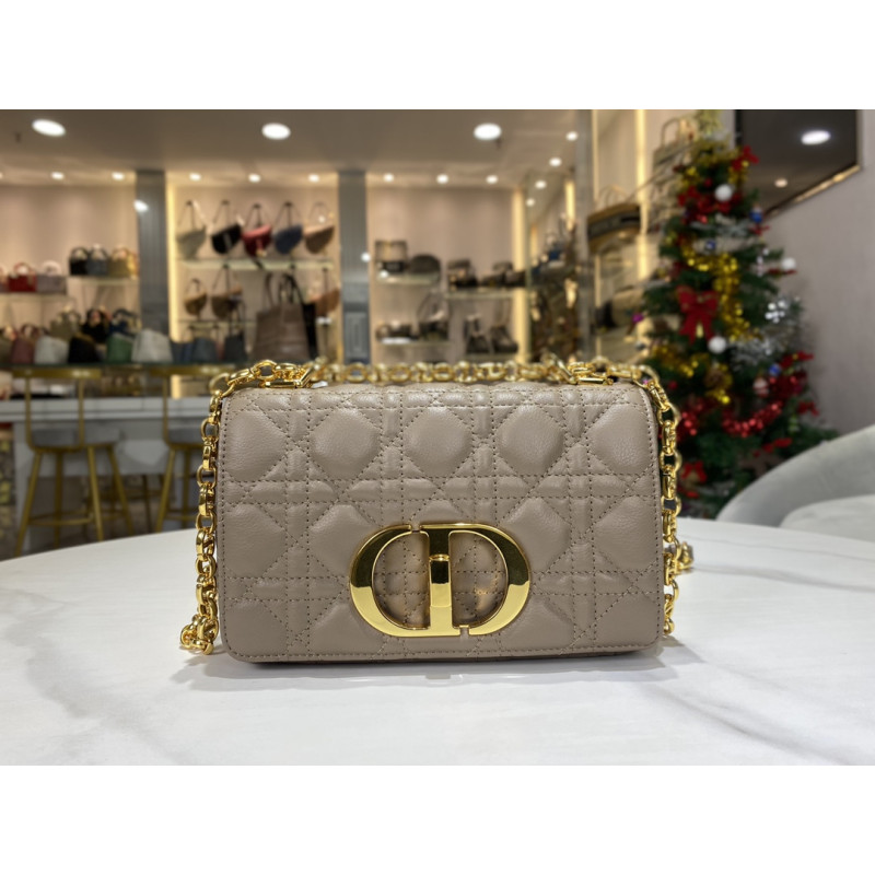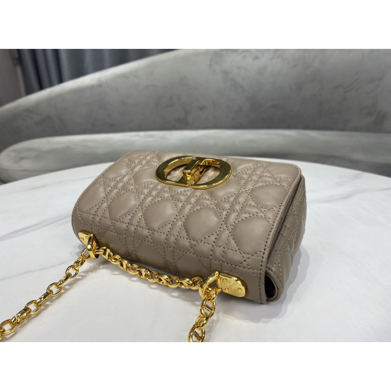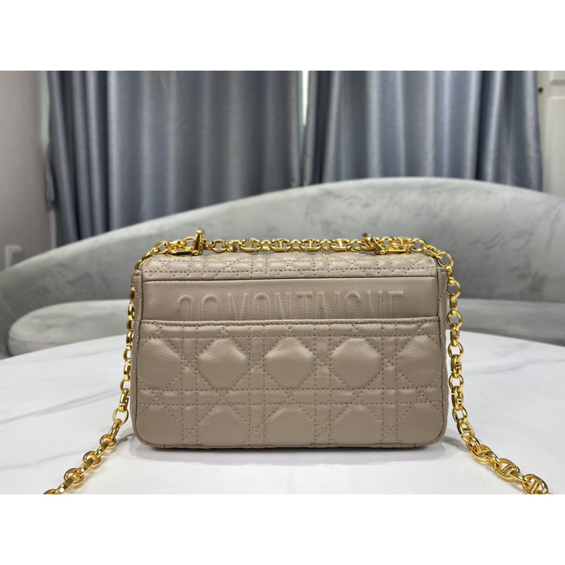 Crafted from calfskin with Cannage stitching. Antique gold-plated metal 'CD' button on the flap, adjustable and detachable chain shoulder strap with 'CD' logo links, can be carried by hand, shoulder or crossbody, and can be matched with different embroidered shoulder straps.