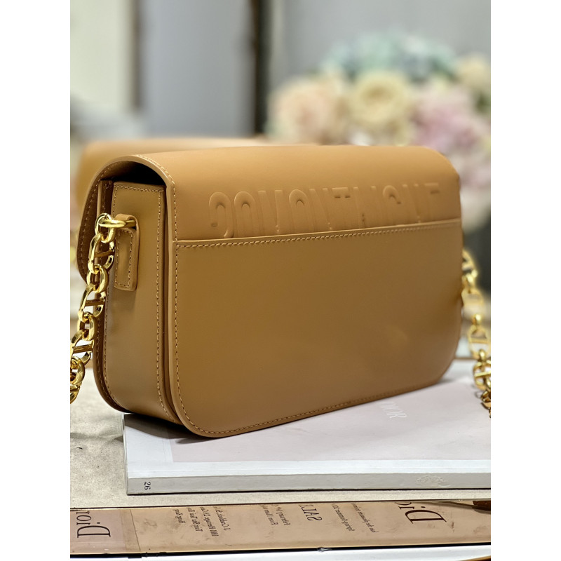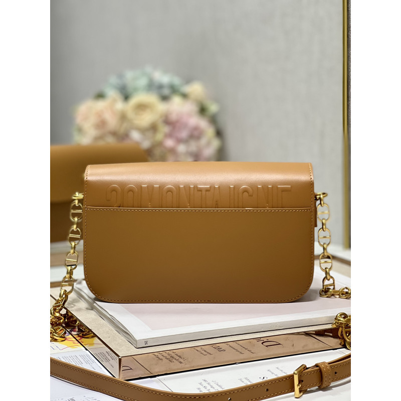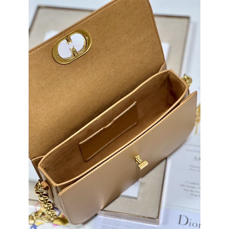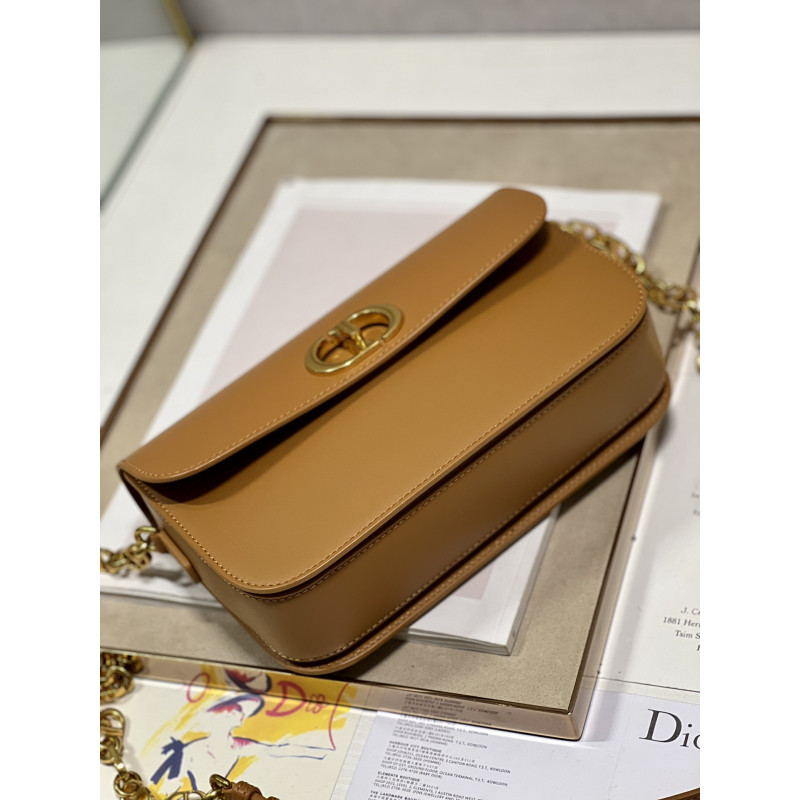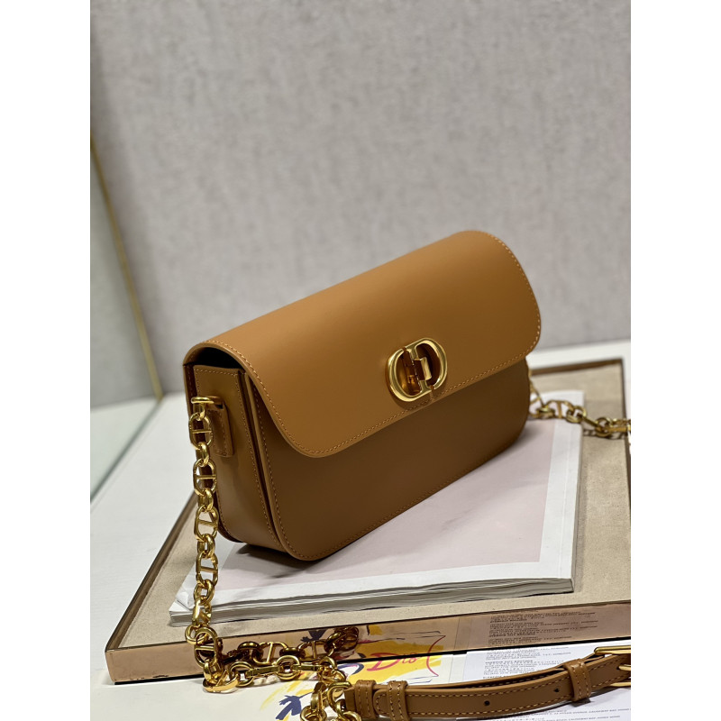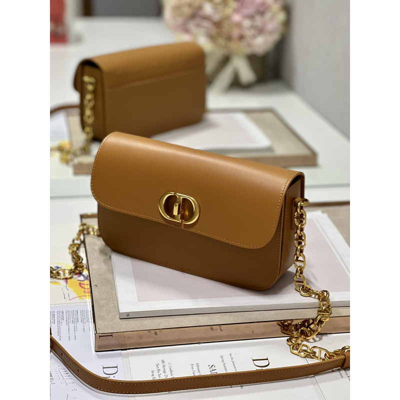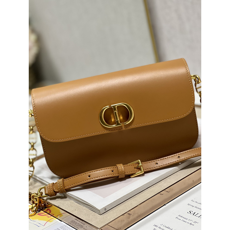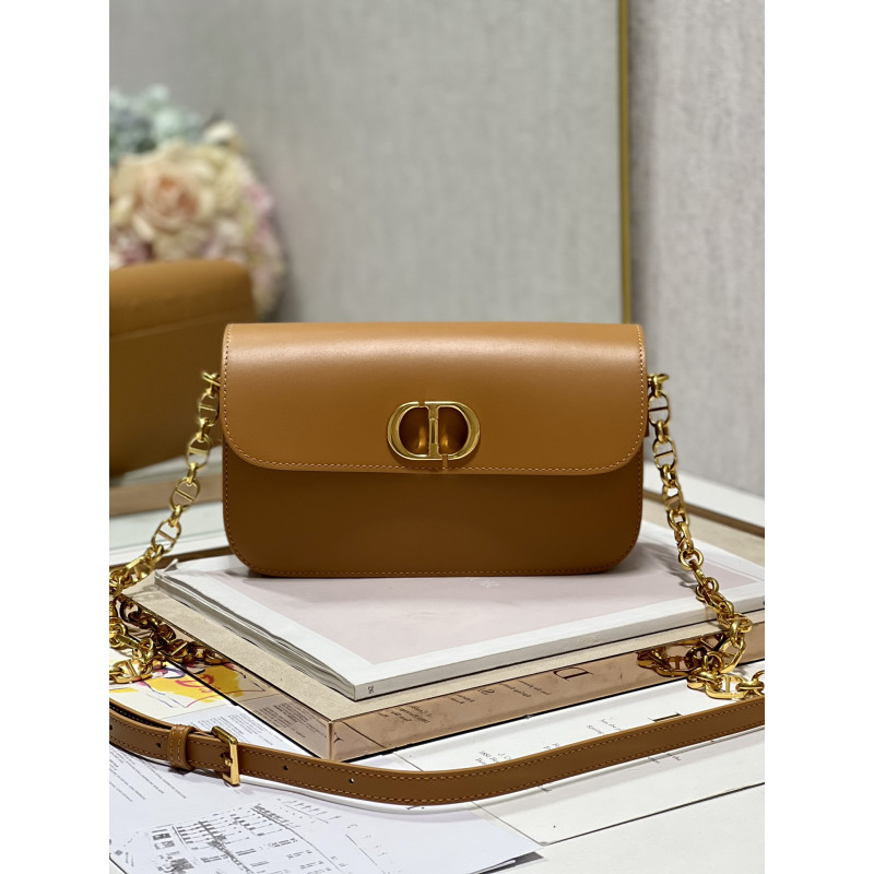 DetailRound flap crafted in calfskin with antiqued gold-plated metal CD clasp, 30 Montaigne logo embossed on the back, and a signature chain with alternating gold-finish metal and tone-on-tone enamel links to match the leather, adjustable. The bag is roomy and refined in shape and can be carried in the hand, over the shoulder or across the body.