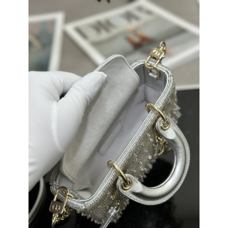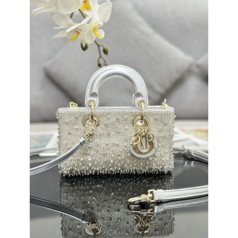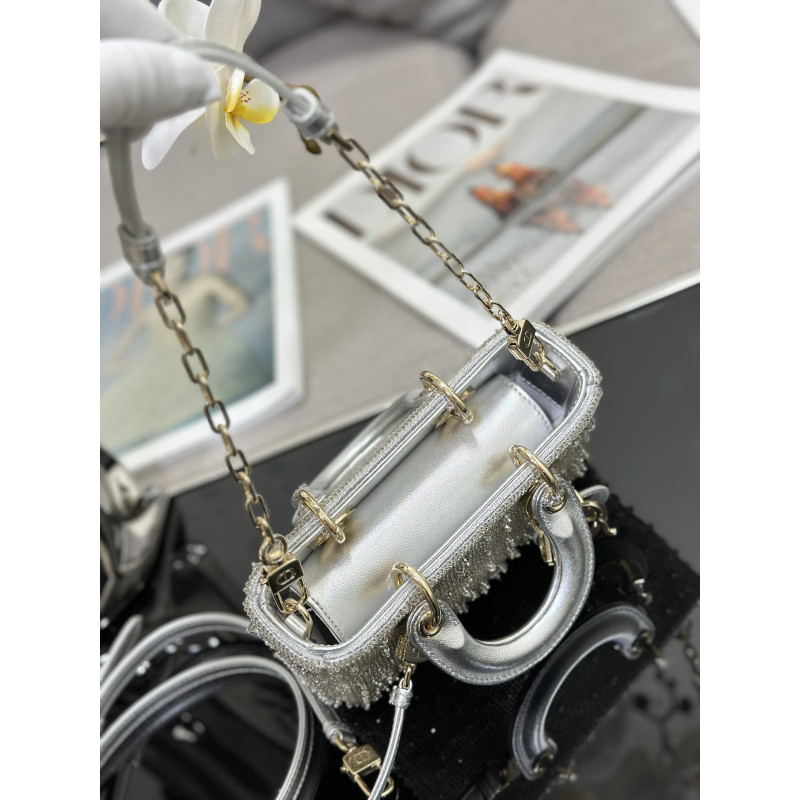 Extra-miniature embroidery beads. Crafted in tonal satin, it's enhanced with ombré-effect beaded embroidery and a D.I.O.R. charm in light gold-finish metal. With a detachable chain shoulder strap and an adjustable, detachable leather shoulder strap, it can be carried by hand, on the shoulder or across the body, making it ideal for everyday or evening looks.
