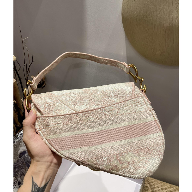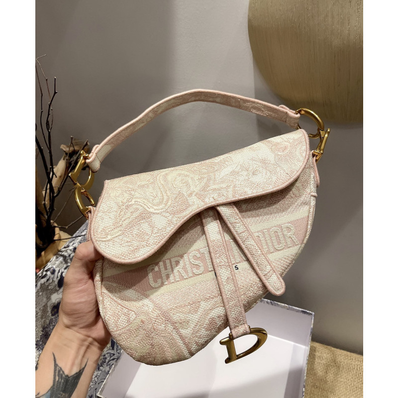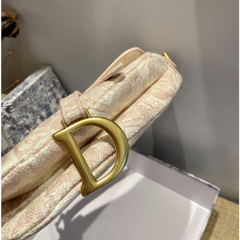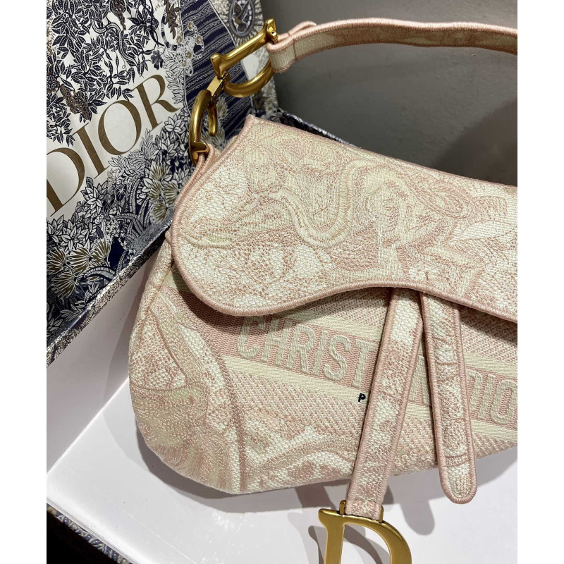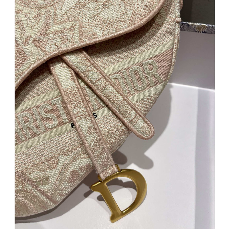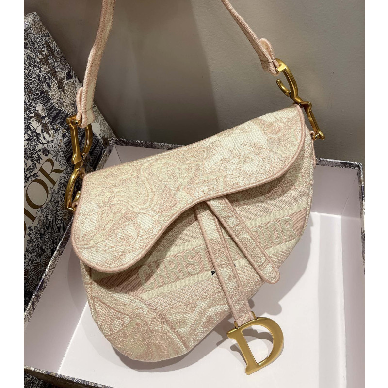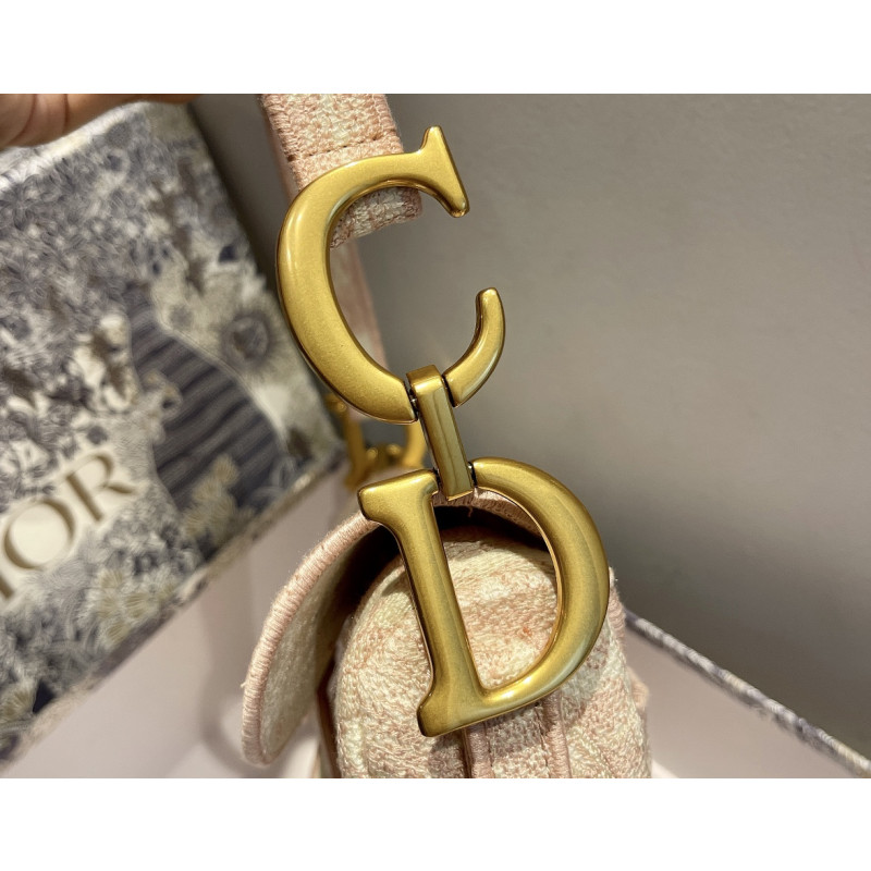 Embroidered with the Toile de Jouy motif, it reveals a saddle flap with a magnetic D-shaped stirrup clasp, as well as a CD signature in antique gold-finish metal on either side of the shoulder strap. This saddle bag has an adjustable and detachable spaghetti strap and can be carried by hand, over the shoulder or across the body.